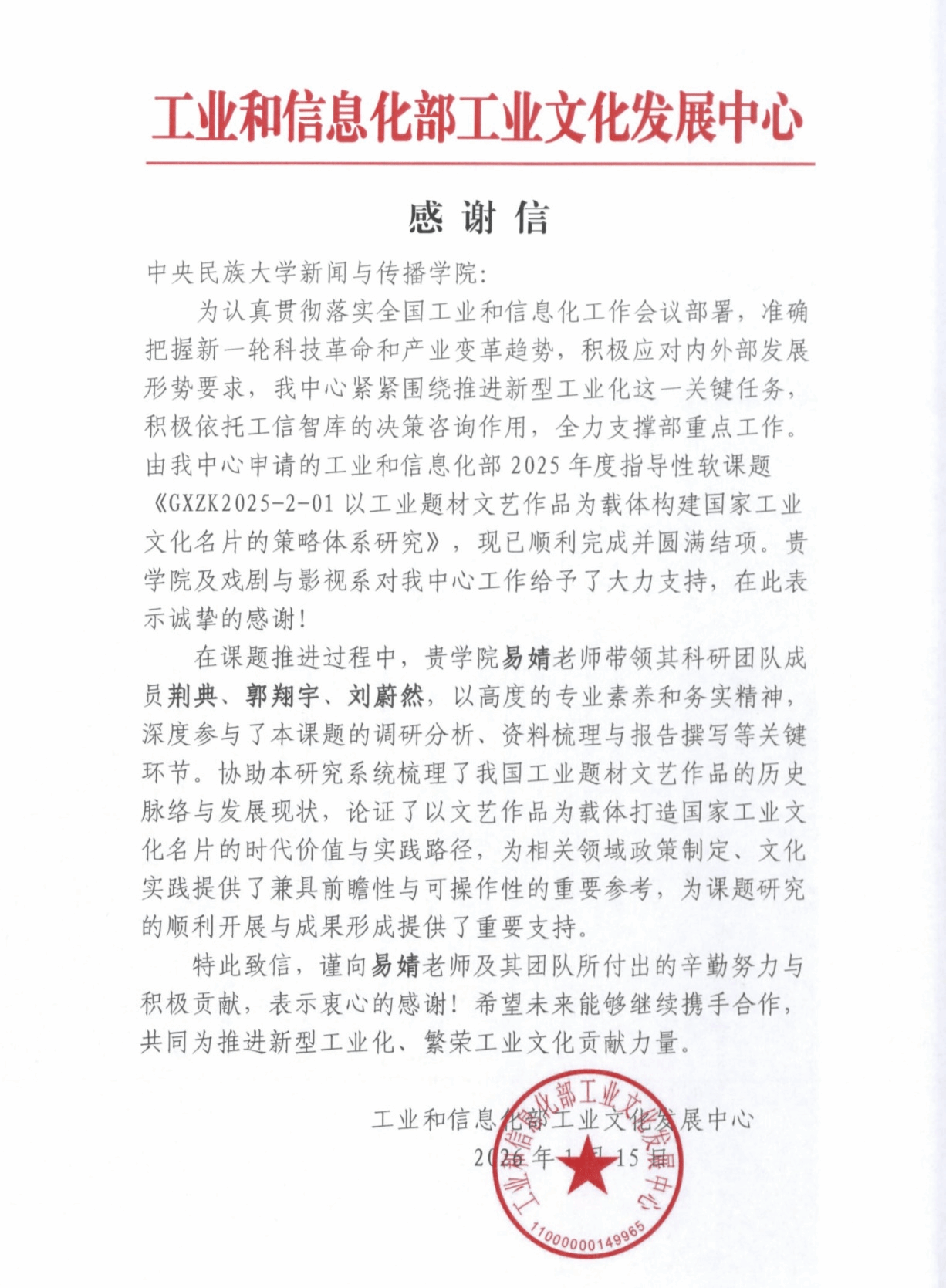 喜报 | 感谢信来啦!青年教师易婧团队助力工信部课题研究和产教融合